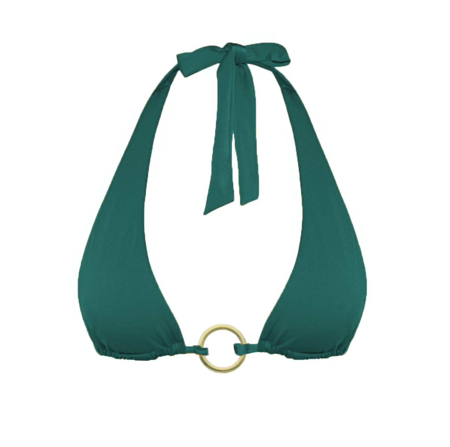 El top BEATRICE de PIVALI estilo halter presenta un aro dorado en la parte delantera, con banda gruesa para dar un mejor soporte y ajuste alrededor del cuello; con lujosas características que incluyen un brillo resplandeciente y doble forro para mayor comodidad.